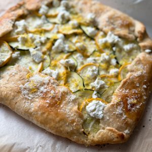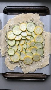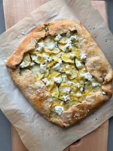 This courgette galette (aka zucchini galette) is a great way to use up all those zucchinis you have! If you’re not familiar with a galette, it’s basically a rustic pie. You make a pastry dough, but instead of putting it in a pie shell, it’s laid flat and the edges are folded around the filling. I’ve been obsessed with galettes this summer, mainly because they’re so easy, and you can turn anything into a galette!