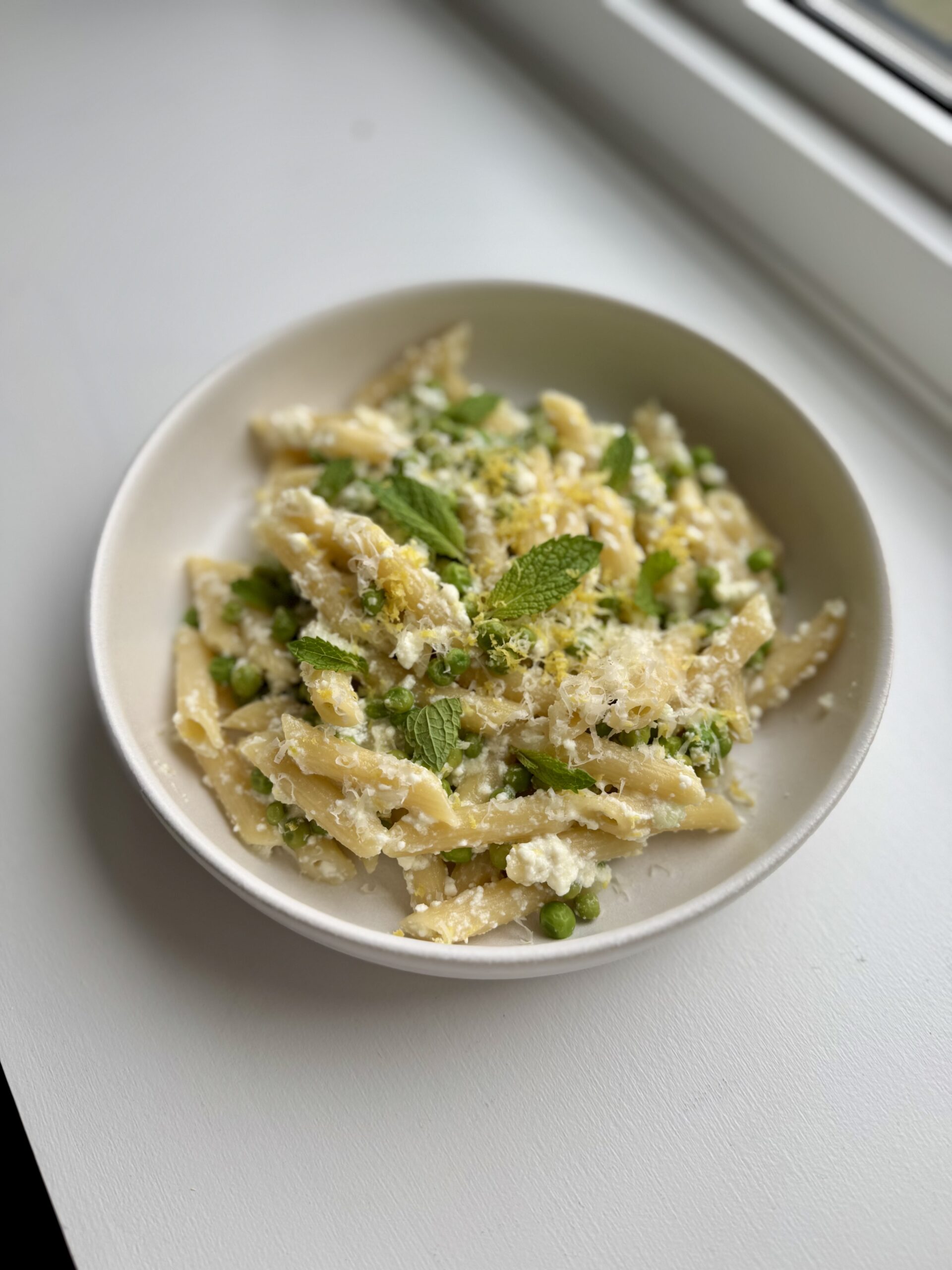 - Step 6: Add ¼ cup pasta water, and stir the pasta into the ricotta and peas. Transfer to bowls, garnish with more lemon zest, parmesan cheese & fresh mint.