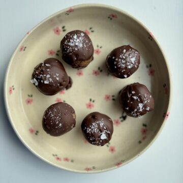 - Once the chocolate is melted, remove from heat, and remove the balls from the freezer. Working one ball at a time, gently place in the melted chocolate and use a fork to coat the entire thing in chocolate. Then transfer to a clean plate. Immediately sprinkle with flaky salt (before the chocolate dries).