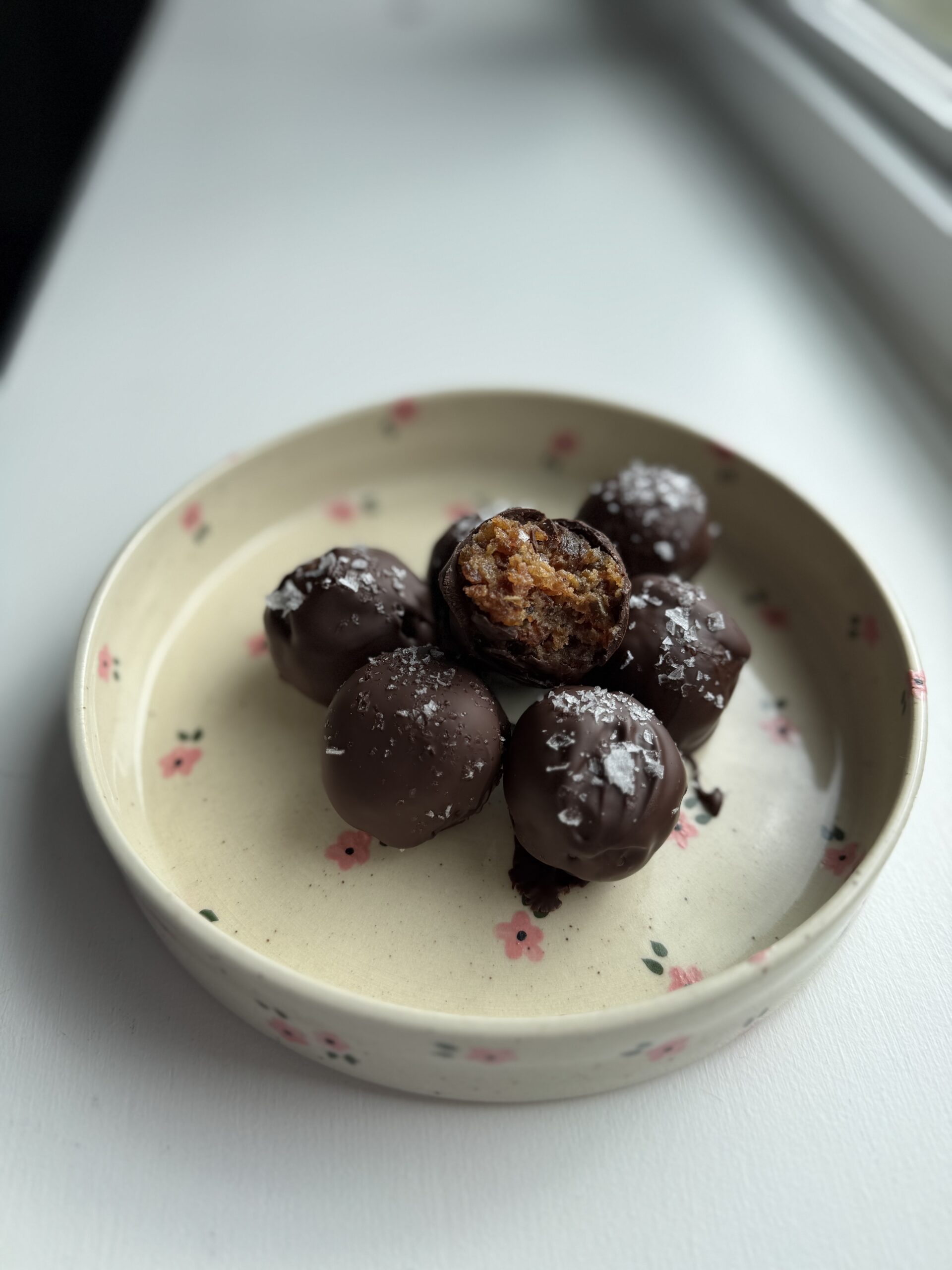 - Repeat until all the balls are covered in chocolate and sprinkled with salt.