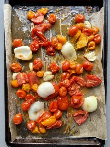 • Wash and dry your tomatoes. If you're using some larger tomatoes, cut them in half or quarters. Transfer to a parchment paper lined baking sheet. Add the garlic and onion. Drizzle with olive oil and salt. Toss to make sure everything is well coated. Roast for about 15-20 minutes or until cherry tomatoes have opened, and garlic is soft.